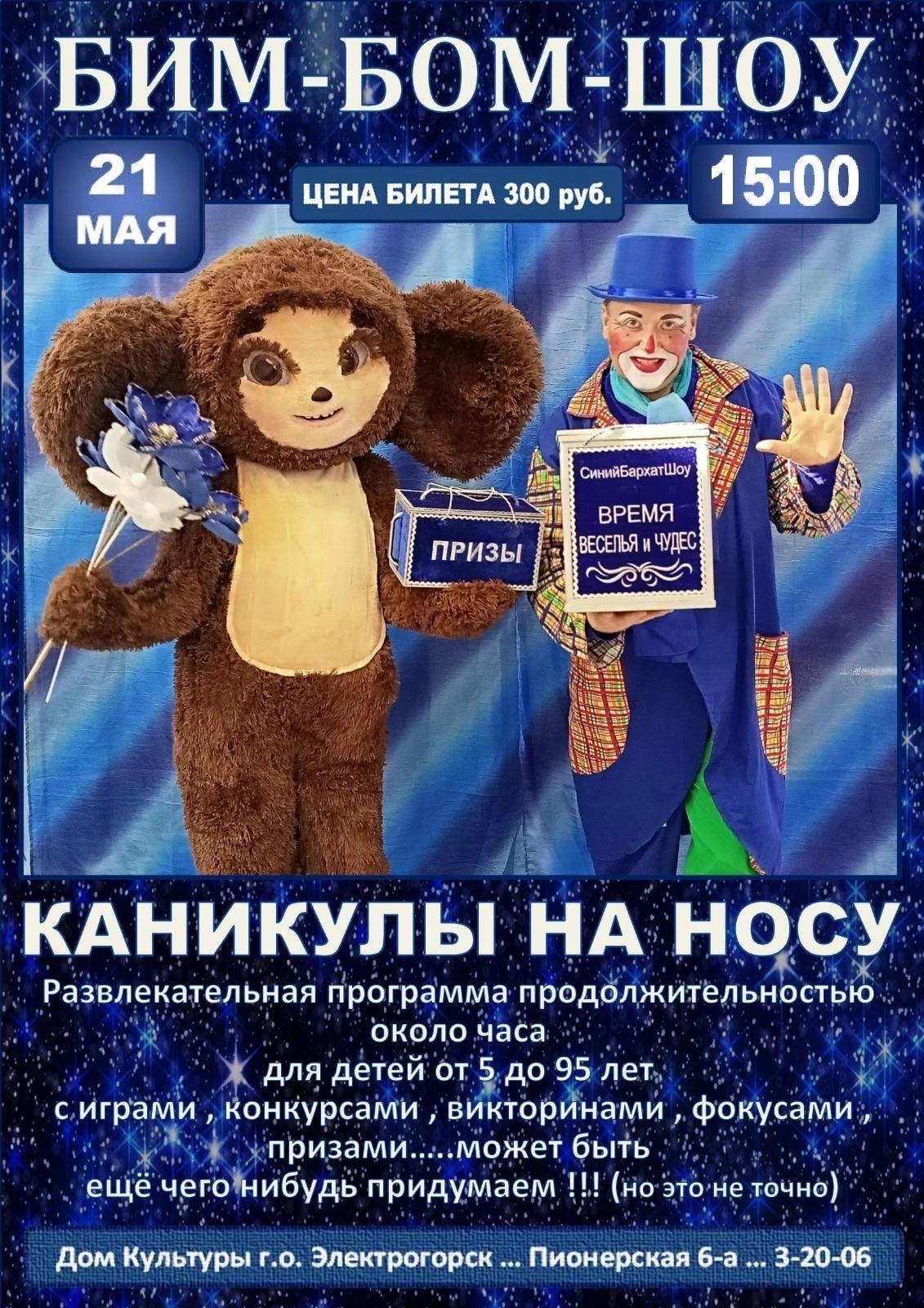21 мая в 15:00 Дом культуры приглашает на Бим-Бом шоу «Каникулы на носу!» Вас ждет развлекательная программа с фокусами, играми, викторинами и призами!