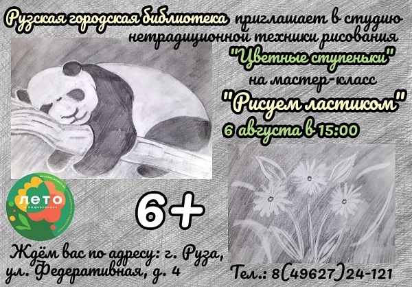 В студии нетрадиционной техники рисования «Цветные ступеньки» Рузской городской библиотеки 6 августа состоится мастер-класс «Рисуем ластиком». Начало в 15 часов.