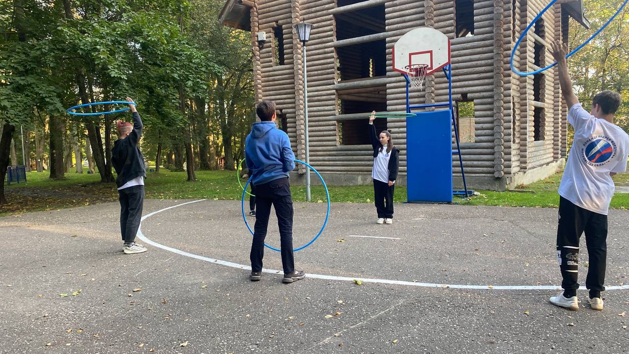 Посетители парка с удовольствием выполняли упражнения с обручем вместе с тренером.