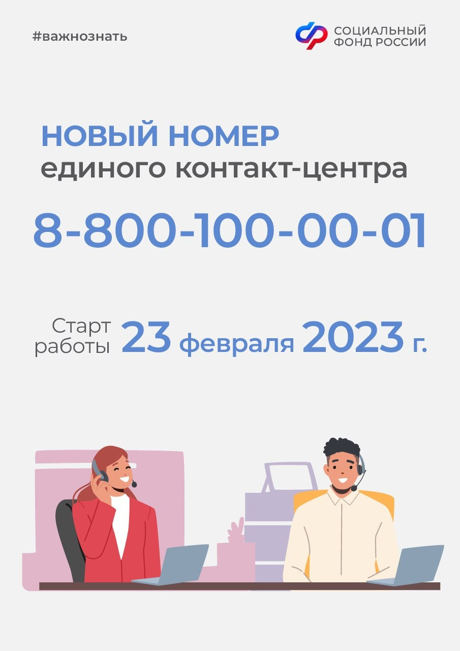 Социальный фонд России (t.me/sfr_gov) представил новый номер единого контакт-центра. С 23 февраля получить консультацию по социальным вопросам можно, позвонив по номеру 8-800-100-00-01.