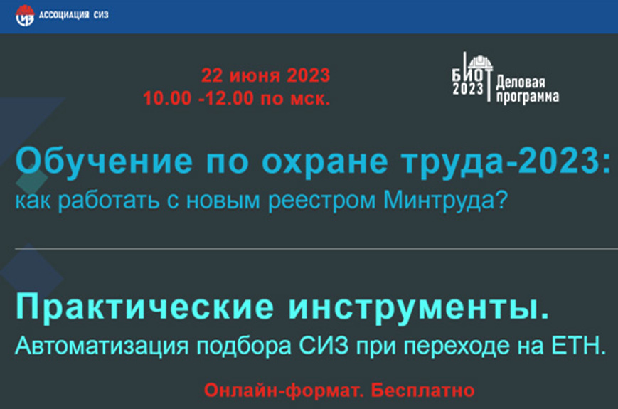 В целях разъяснения новых требований 22.06.2023 в 10:00 Ассоциация разработчиков, изготовителей и поставщиков средств индивидуальной защиты (Ассоциация «СИЗ») в рамках экосистемы БИОТ при поддержке Минтруда России проведёт бесплатную онлайн-конференцию для работодателей, руководителей и специалистов служб охраны труда и промышленной безопасности на тему: «Обучение по охране труда-2023: как работать с новым реестром Минтруда? Практические инструменты. Автоматизация подбора СИЗ при переходе на ЕТН».