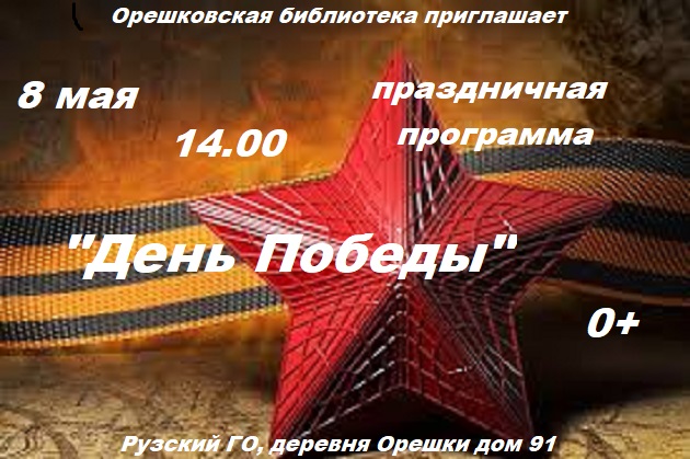 Орешковская сельская библиотека Рузского городского округа приглашает детей и взрослых на праздничную программу «День Победы».