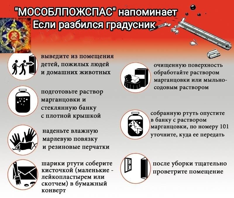 Работники ГКУ МО   напоминают Что делать если разбился ртутный градусник   : Откройте форточку в комнате, закройте дверь, чтобы загрязненный воздух не попадал в другие помещения,