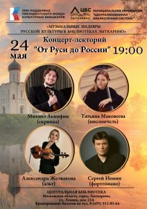 В День славянской культуры и письменности 24 мая в 19-00 часов в Центральной библиотеке города Лыткарино состоится концерт-лекторий «ОТ РУСИ ДО РОССИИ» в рамках проекта «Музыкальные шедевры русской культуры в библиотеках Лыткарино» при поддержке Президентского фонда культурных инициатив.
