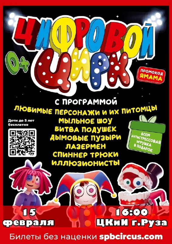 Центр культуры и искусств Рузы приглашает всех желающих 15 февраля в 16.00 на шоу, действия которого происходит в Цифровом цирке. Яркие персонажи, искрометный юмор, дрессированные животные. С каждым номером вы знакомитесь с новым героем: Кейном, Рагатой, Джексом и другими. Вы отправитесь в захватывающее приключение по лабиринтам цирка. Ведущий постоянно придумывает для них забавные испытания. Многие из них опасны и их не стоит повторять. Юные зрители увидят схватку в лазерном поединке. Миллионы мыльных пузырей в Иллюзионном аттракционе. Вы не просто смотрите, а участвуете и помогаете главной героине найти выход в реальный мир. Удивительный Цифровой цирк — это место, которым наслаждаются зрители всех возрастов. После представления каждого ждёт подарок - игрушка антистресс.
