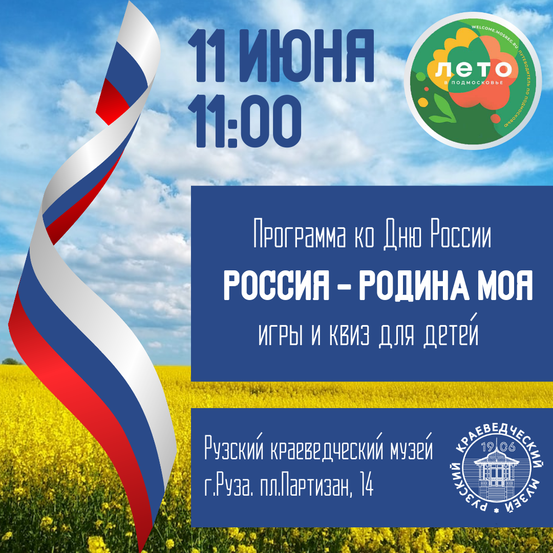 11 июня в 11.00 в Рузском краеведческом музее пройдёт программа «Россия - Родина моя», приуроченная ко Дню России.