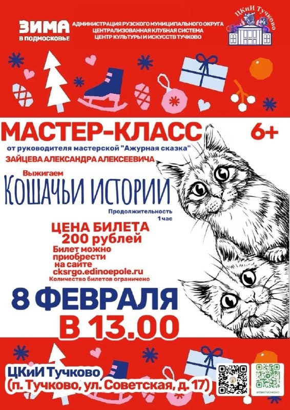 Центр культуры и искусств Тучково приглашает всех желающих на мастер-класс «Кошачьи истории» 8 февраля в 13.00.