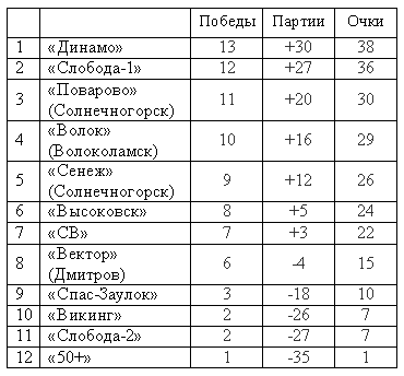 Результаты остальных матчей: «Слобода-1» — «Вектор» 3:2 (21:25, 25:22, 17:25, 25:21, 15:10), «50+» — «Волок» 0:3 (16:25, 23:25, 22:25), «Викинг» — «Высоковск» 0:3 (9:25, 7:25, 9:25), «Слобода-2» — «Сенеж» 0:3 (12:25, 15:25, 17:25), «Спас-Заулок» — «СВ» 0:3 (20:25, 24:26, 18:25).