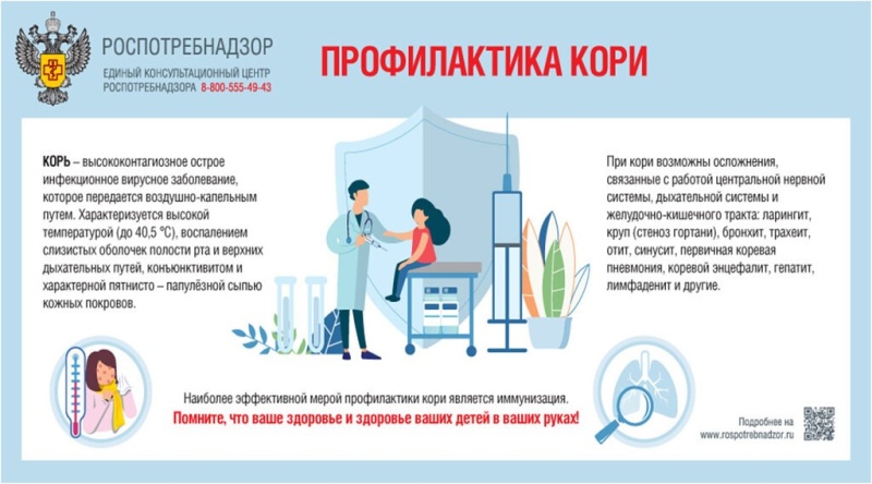 Специфические мероприятия - иммунизация против кори. Вакцинацию проводят в возрасте 1 года, ревакцинацию - в 6 лет, перед школой. Взрослым в возрасте 18-35 лет для защиты от этой инфекции, а также взрослым от 36 до 55 лет (включительно), относящиеся к группам риска, работники медицинских организаций, образовательных организаций, организаций торговли, транспорта, коммунальной сферы, социальной сферы, лица, работающие вахтовым методом, сотрудники государственных контрольных органов в пунктах пропуска через государственную границу Российской Федерации необходимо иметь две прививки.